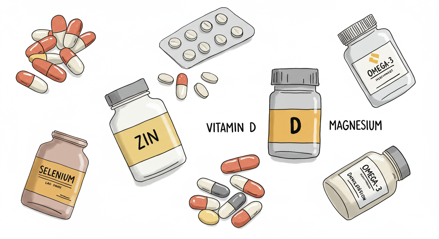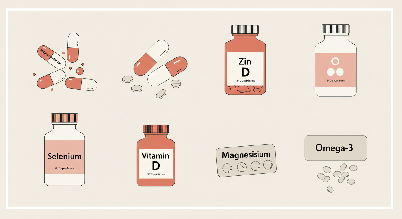 A1. 셀레늄, 아연, 비타민 D, 마그네슘, 오메가-3 등이 도움 될 수 있습니다.