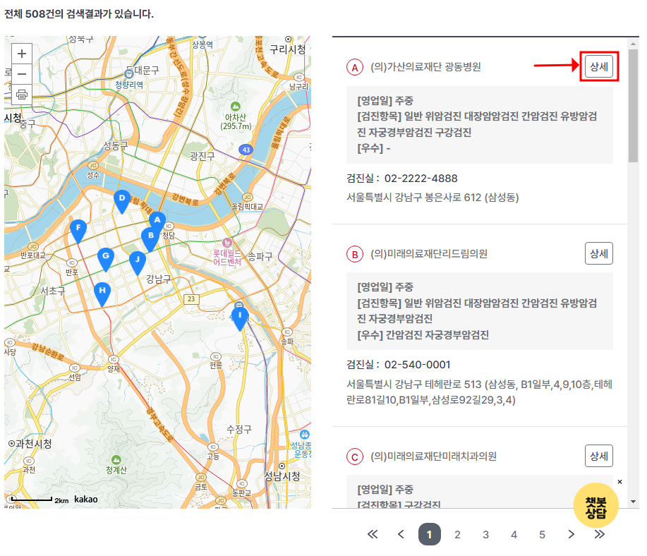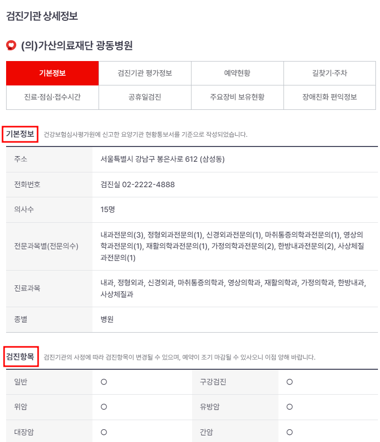 상세 버튼을 누르면 의료기관의 기본정보부터 검진항목까지 자세히 살펴볼 수 있어요.