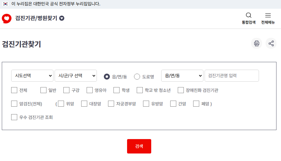 검진기관/병원찾기 메뉴를 통해 검진기관을 찾아볼 수 있는데요. 시도를 선택하고 시/군/구를 선택한 후 전체, 일반, 구강, 영유아, 학생, 학교 밖 청소년, 장애친화 검진기관, 암검진, 우수 검진기관까지 모두 조회할 수 있답니다.