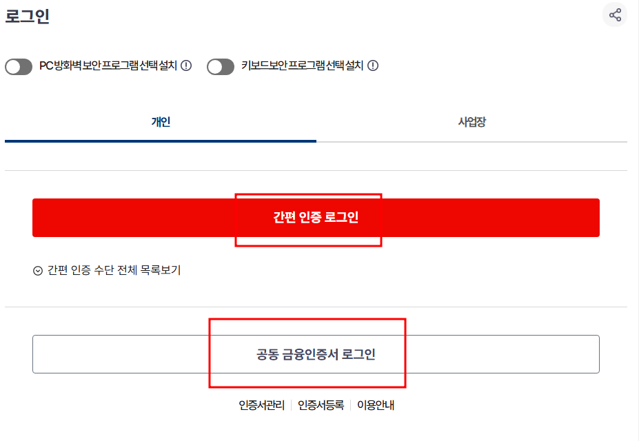 3)간편 인증 로그인, 공동 금융인증서 로그인 모두 가능합니다.