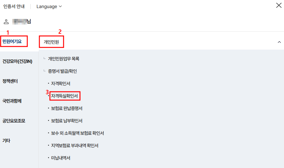 4) 로그인 후, 전체 메뉴 -> 민원여기요 -> 개인민원 -> 자격득실확인서를 선택합니다.
