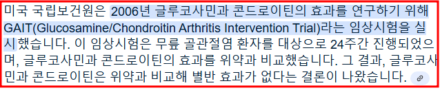 자세히 말하자면, 골관절염에서 글루코사민은 통증을 감소시키고 기능이 향상되며, 관절강 소실이 예방된다는 효과에 대해서는 어느 정도 의미 있는 효과를 보여주었지만 결과에 일관성이 없었다는 것이다.