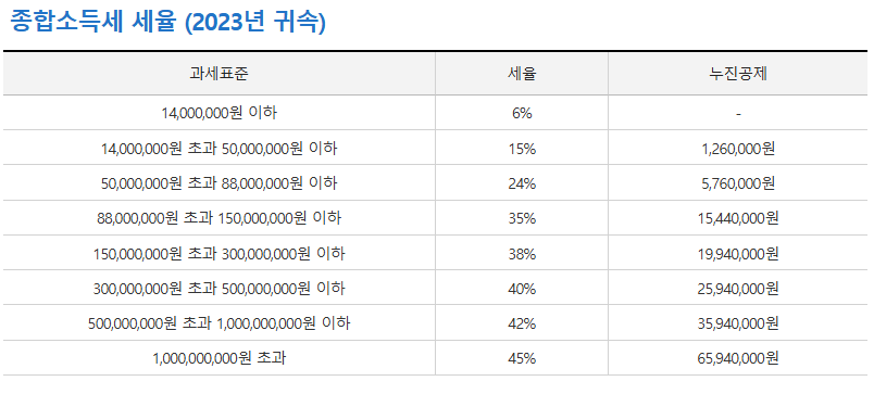 과세 대상 소득이 결정되면, 해당 소득에 대한 종합소득세율을 적용하여 최종 세액을 계산합니다. 종합소득세율은 누진세율로, 소득이 높아질수록 세율이 증가합니다.