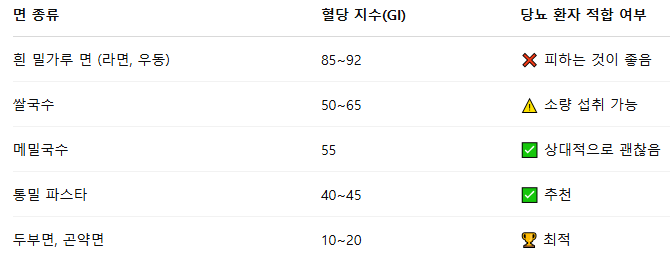 위 표를 보면, 흰 밀가루 면은 혈당을 급격히 올리므로 피하는 것이 좋아요. 하지만 메밀국수, 통밀 파스타, 곤약면은 상대적으로 혈당을 덜 올리므로 적절하게 활용하면 됩니다.