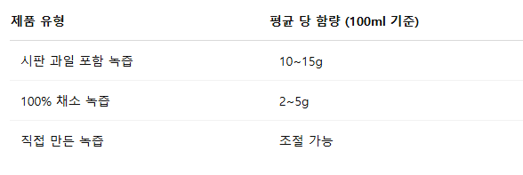 ➡ 직접 만든 녹즙이 첨가물 없이 건강에 더 좋아요. 시판 제품을 선택할 경우 당 함량을 꼭 확인하세요!