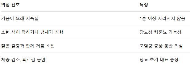 → 네. 특히 단백뇨가 함께 나타나면 당뇨 초기 신호일 수 있으니 꼭 혈당 검사를 받아보세요.