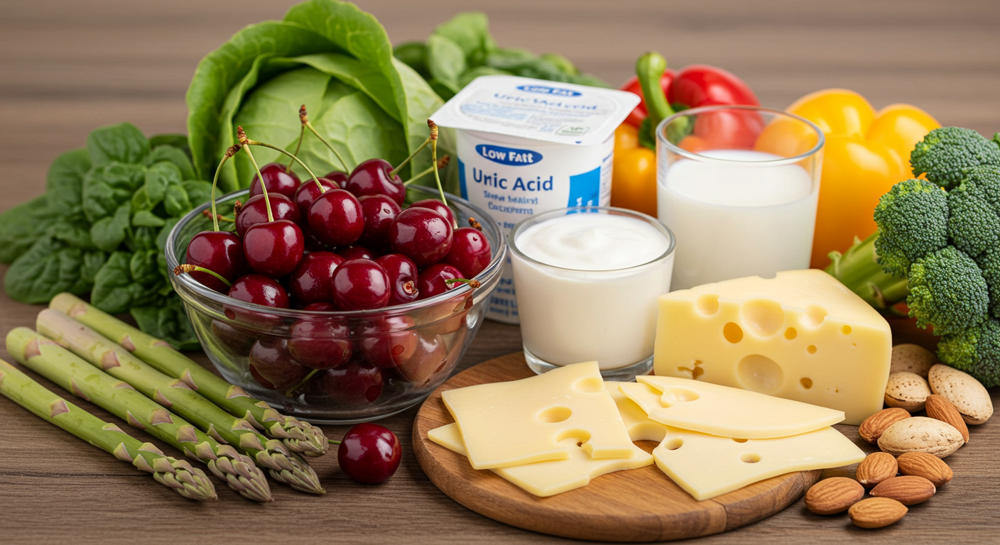 요산 수치를 낮추려면 채소, 과일, 저지방 유제품을 많이 섭취하고, 물을 충분히 마시는 것이 중요합니다. 특히 체리는 요산 수치를 낮추는 데 유익합니다.
