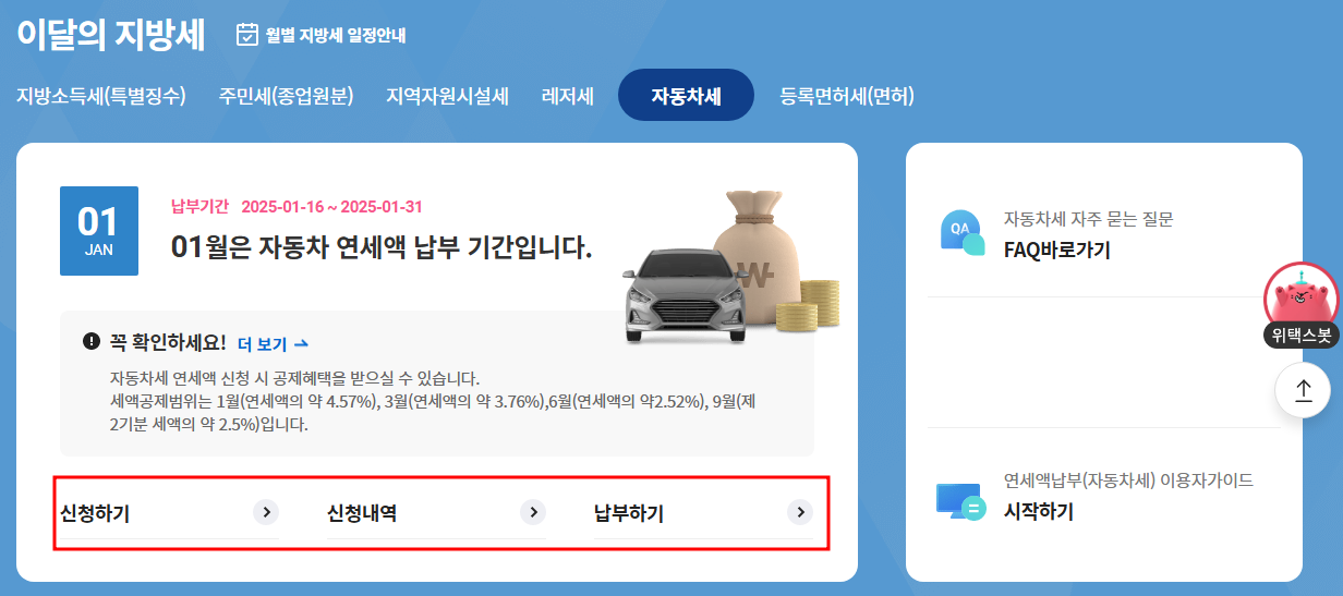 위택스 홈페이지나 어플을 통해 자동차세 연납 신청 메뉴로 편하게 납부하실 수 있습니다.