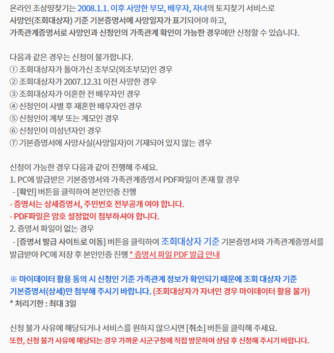 온라인으로 신청하실 땐 2008년 1월 1일 이후에 사망한 부모와 배우자, 자녀 토지를 대상으로 조회할 수 있는데요. 사망자 기준 기본증명서와 가족관계증명서를 전자문서로 첨부하셔서 진행하시면 됩니다.