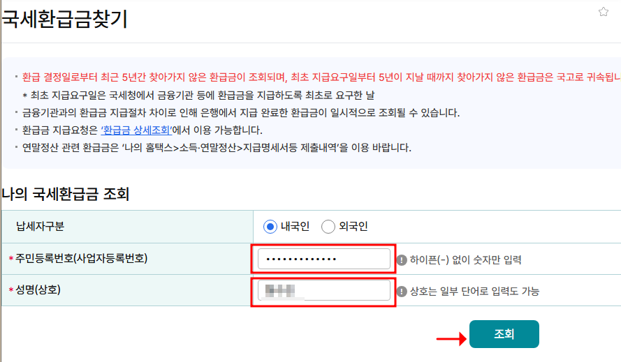 5. 나의 국세환급금 조회에서 [주민등록번호], [성명] 입력 후 조회