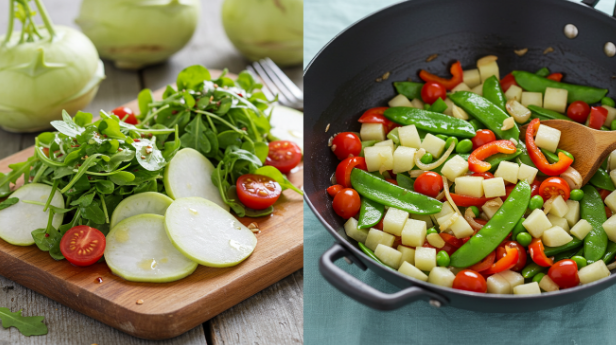 생으로 먹을 때는 껍질을 벗기고, 얇게 썰어서 먹으면 더 맛있어요. 그 외에도 볶음이나 조림으로도 즐길 수 있어요. 특히, 볶음 요리에서 콜라비의 아삭한 식감과 함께 다른 재료와 잘 어울려요.