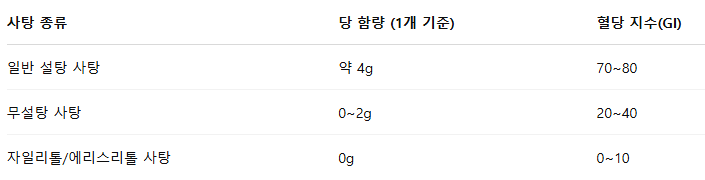 ➡ 혈당 조절을 위해서는 일반 사탕보다는 저당 사탕이나 대체 감미료가 들어간 제품을 선택하는 것이 좋아요.