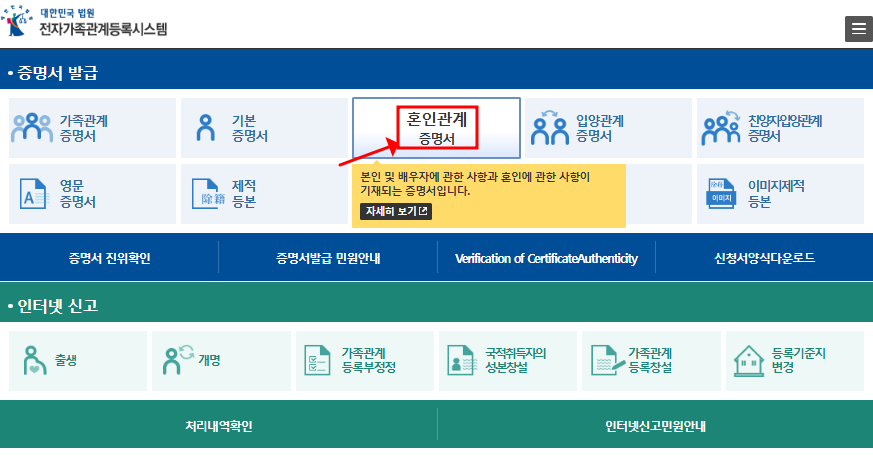 2. 로그인 후, 증명서 발급 메뉴에서 [혼인관계 증명서] 선택