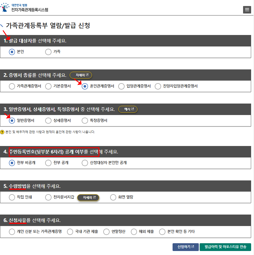 4. 가족관계등록부 열람, 발급 신청란인데요. 발급 대상자, 증명서 종류, 주민등록번호 공개 여부, 수령방법, 신청사유를 선택해주세요.
