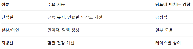 단백질과 아미노산은 인슐린 기능 개선에 도움을 줄 수 있지만, 모든 흑염소 제품이 효과적인 것은 아니며, 가공 방식에 따라 당분이 첨가된 경우도 많아 주의가 필요해요.